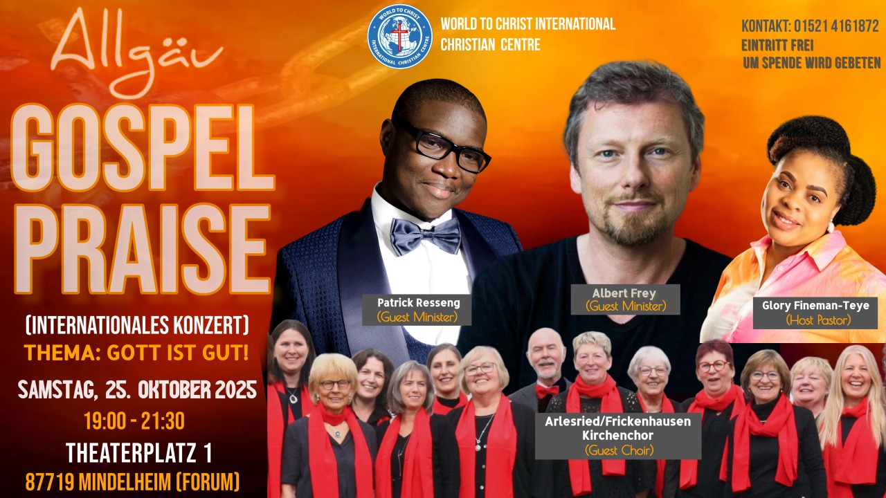 Allgäu Gospel Praise – Gott ist gut! 🎶 Am Samstag, den 25. Oktober 2025, laden wir herzlich zu einem besonderen internationalen Gospelkonzert in Mindelheim ein. Unter dem Thema „Gott ist gut!“ erwartet euch ein Abend voller Musik, Freude und Glauben. Mit dabei sind Patrick Resseng und Albert Frey als Gastminister, sowie der Arlesried/Frickenhausen Kirchenchor. Gastgeberin […]